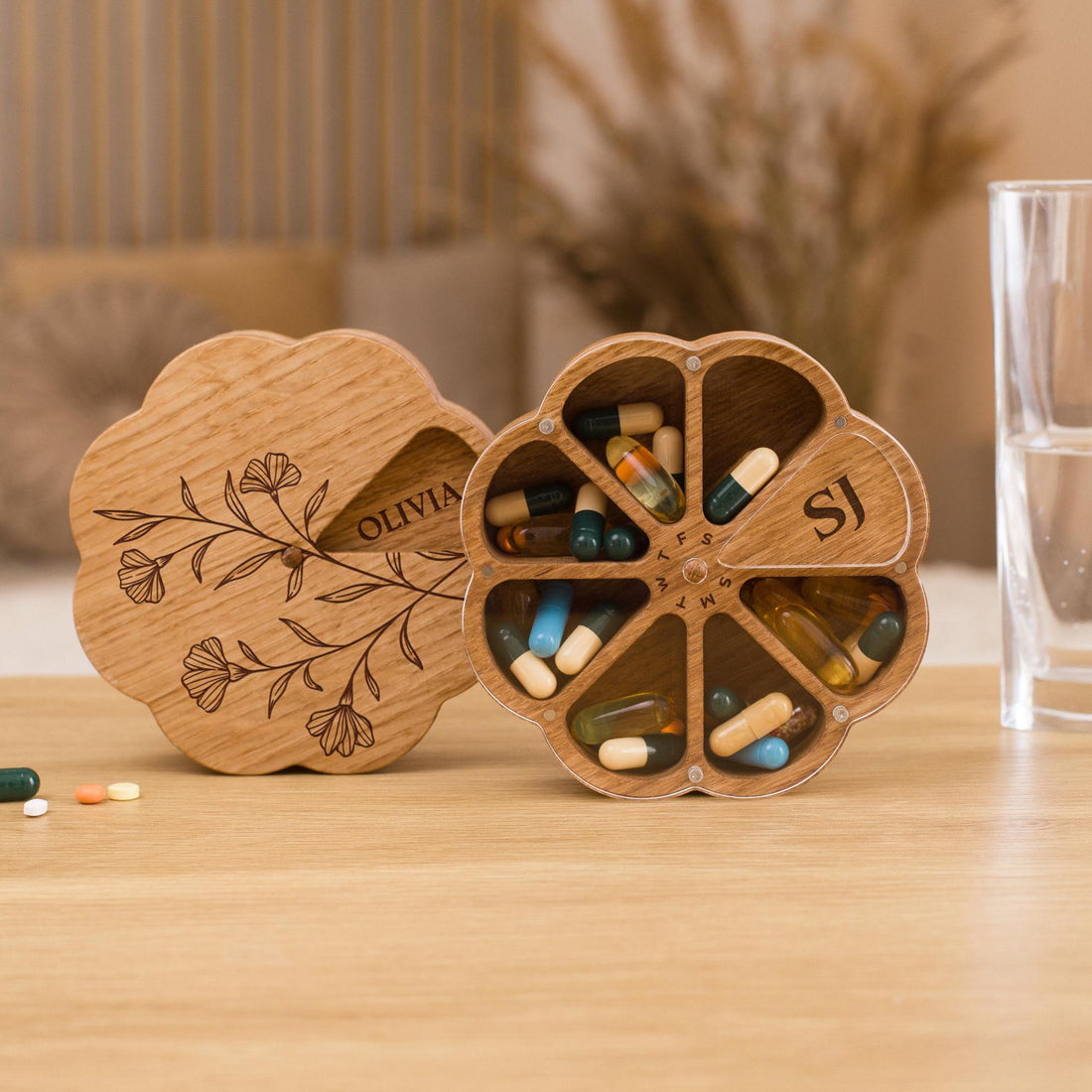 Daily Pill Organizer, Pill Container, Weekly Pill Box, Wooden Pill Case 7 Day, Vitamin Organizer