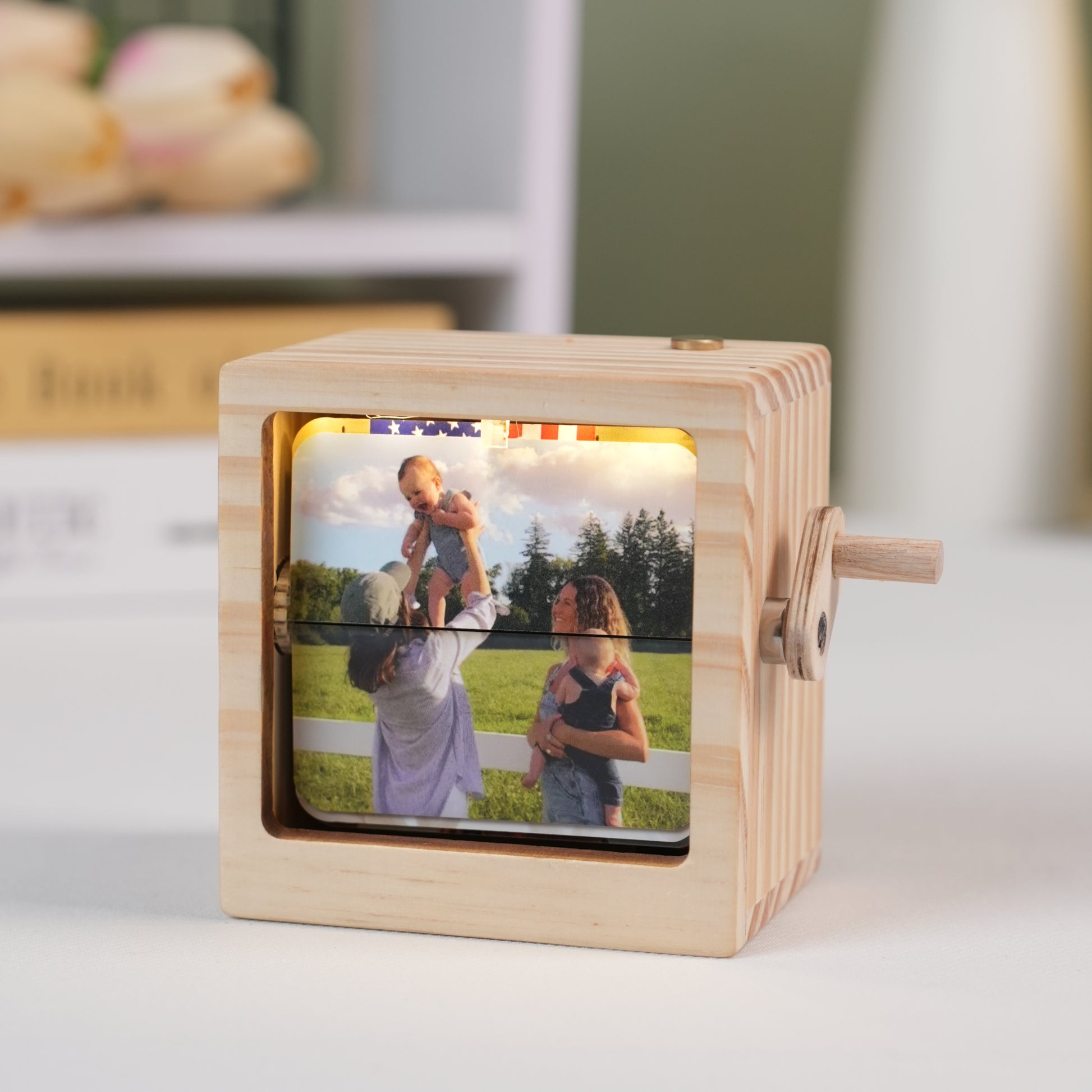 Designed with a manual crank mechanism, each turn brings your memories to life - one frame at a time. The built-in light enhances the display, turning it into a warm, thoughtful piece of home décor.