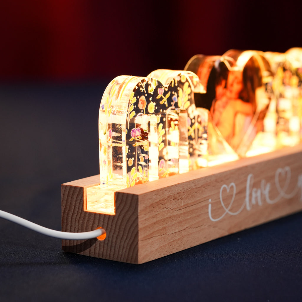 - Acrylic + Wooden Base + Integrated LED Lighting + Convenient USB cable wire