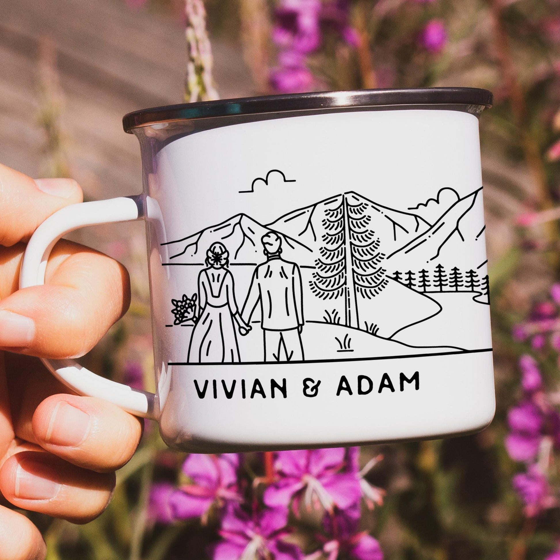 Personalized Wedding Gift, Bride & Groom Mountain Romantic Enamel Mug, Unique Engagement Present for Outdoorsy Couple